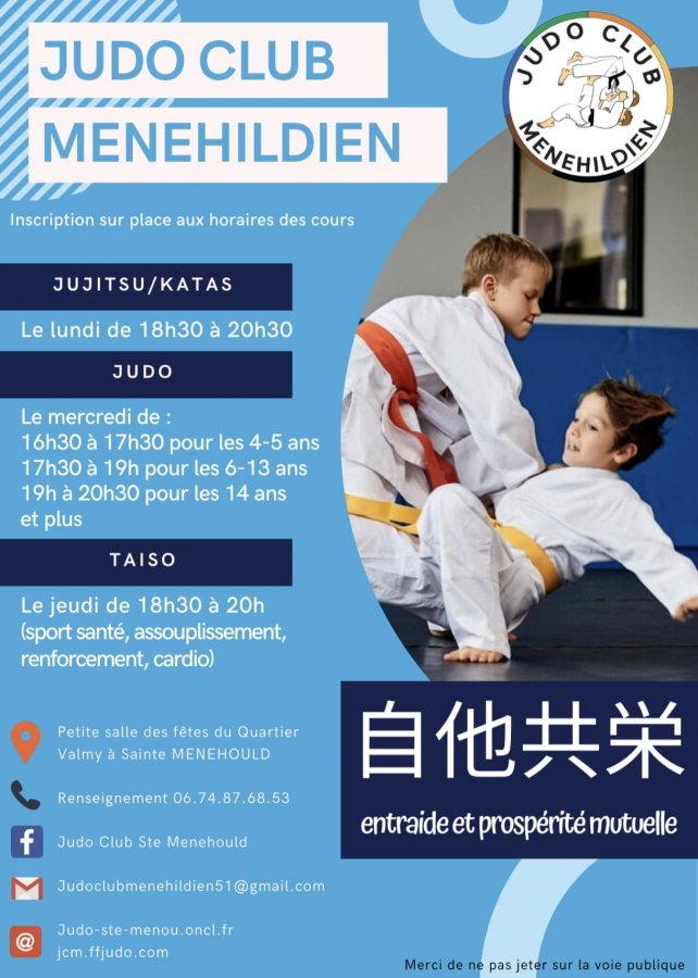 Le mercredi de 16h30 à 17h30 pour les éveils judo (4 / 5 ans) de 17h30 à 19h00 pour les 6 / 13 ans de 19h00 à 20h30 pour les 14 ans et plus